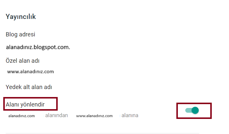 Bu olayın çözümü oldukça basit. Öncellikle blogger üzerinden ayarlar kısmından alanı yönlendir kısmını aktif hale getirin.